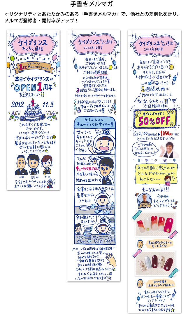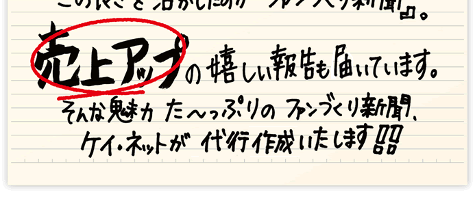 | 「手書きなら何でもよい」というわけではありません。そこには、御社だけの熱い想いと読ませるテクニックが必要です。ケイ・ネットのファンづくり新聞なら、これらの問題を解決!お決まりのフォーマットに社名を入れる簡易的なものではなく、御社のスタッフさんのように「本気」でおつくりします。 |